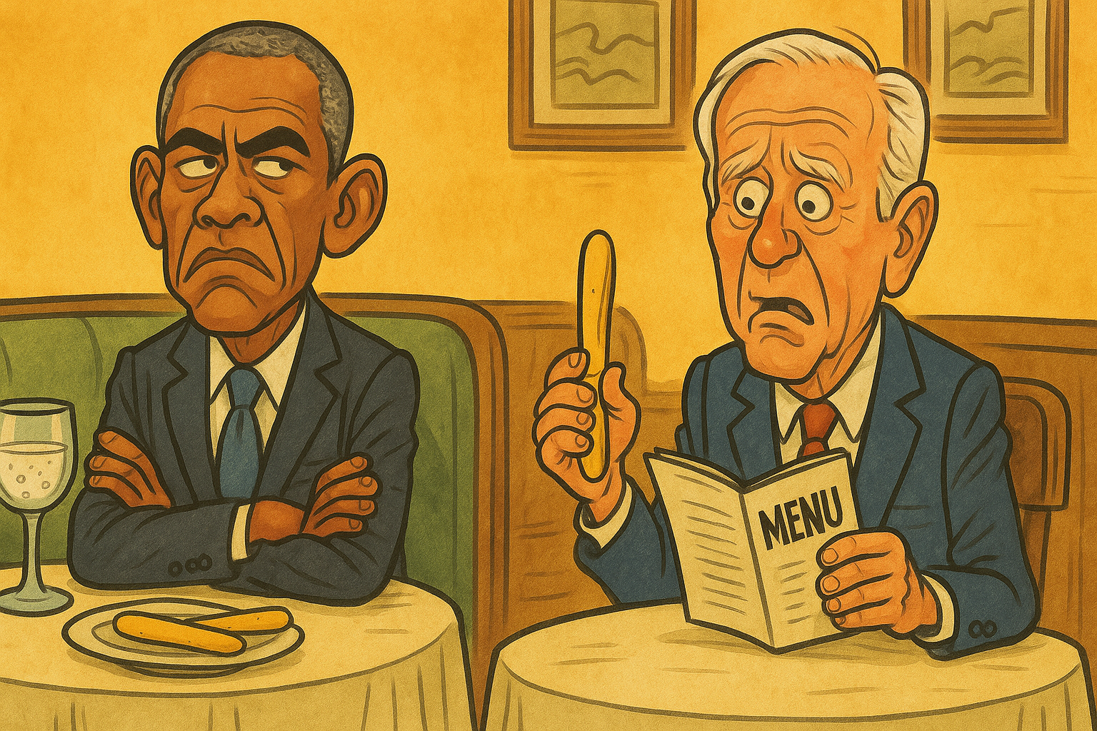 Witnesses described the atmosphere as “middle-school breakup energy,” noting that Obama sat stiffly at his table, swirling sparkling water and staring into the distance like a man betrayed by destiny, while Biden repeatedly asked the waiter whether “Barry was running late,” unaware Obama was sitting 14 feet away under a light fixture.