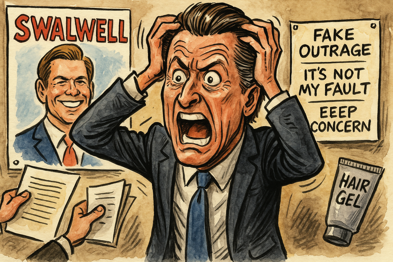 Hollywood donors reportedly told him to stay calm, reminding him that “California is used to bad acting,” but Newsom allegedly paced the room shouting that Swalwell might reveal another closely guarded secret — that his hair and make-up budget alone is larger than the state’s wildfire mitigation plan.