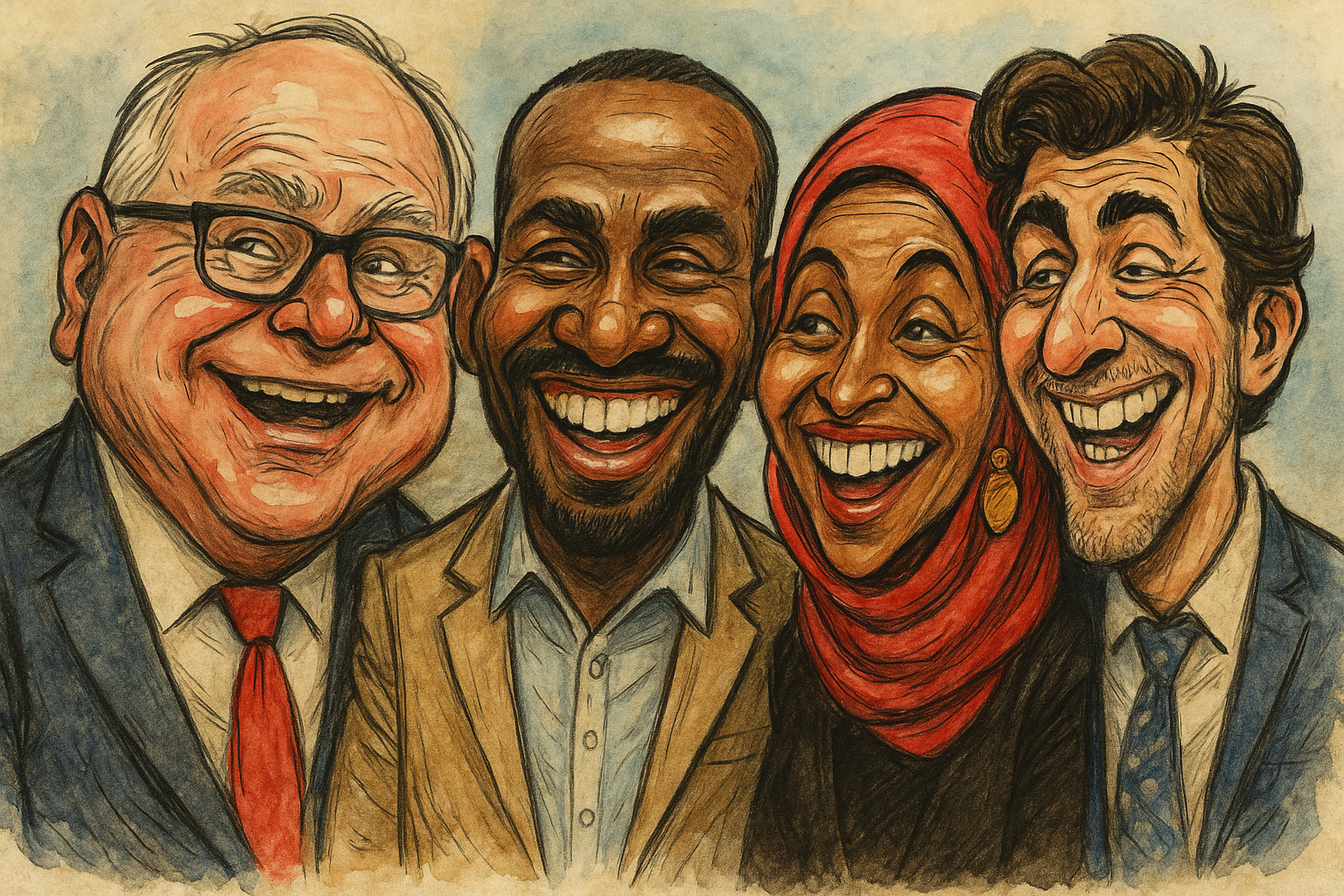 In the photos, Tim Walz, Ilhan Omar, and Omar Fateh appear smiling beside Ibrahim as though he were a “global influencer in the field of creative accounting.”