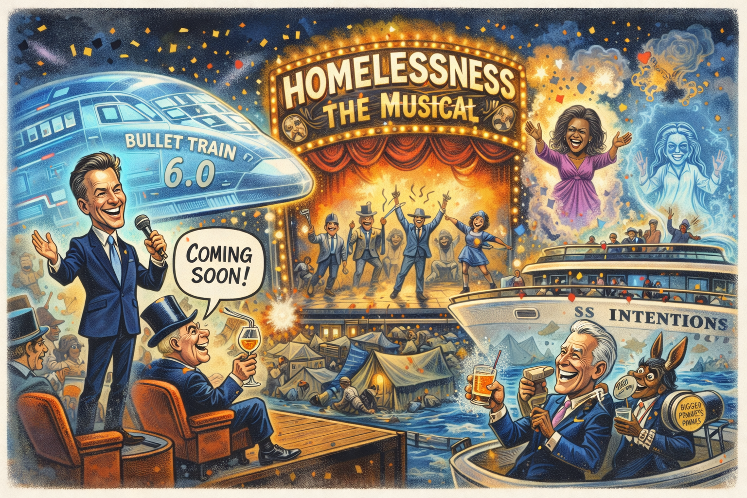 Local officials insist that spending billions on theatrics is actually “advanced governance,” while trash fires, tent encampments, and broken rail projects remain “immersive set design.”