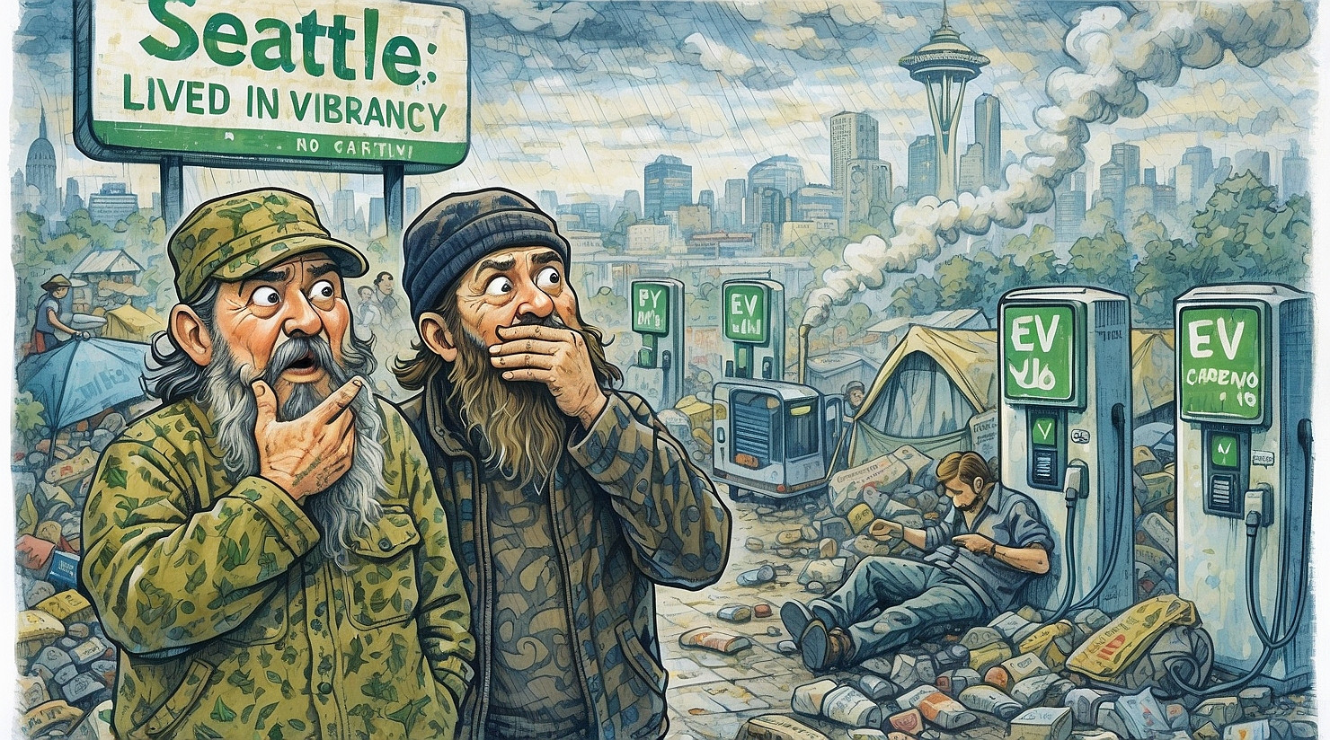 Instead, leaders highlighted their real achievements, noting that despite widespread disorder, residents can enjoy an impressive number of electric vehicle charging stations placed strategically near tent encampments.