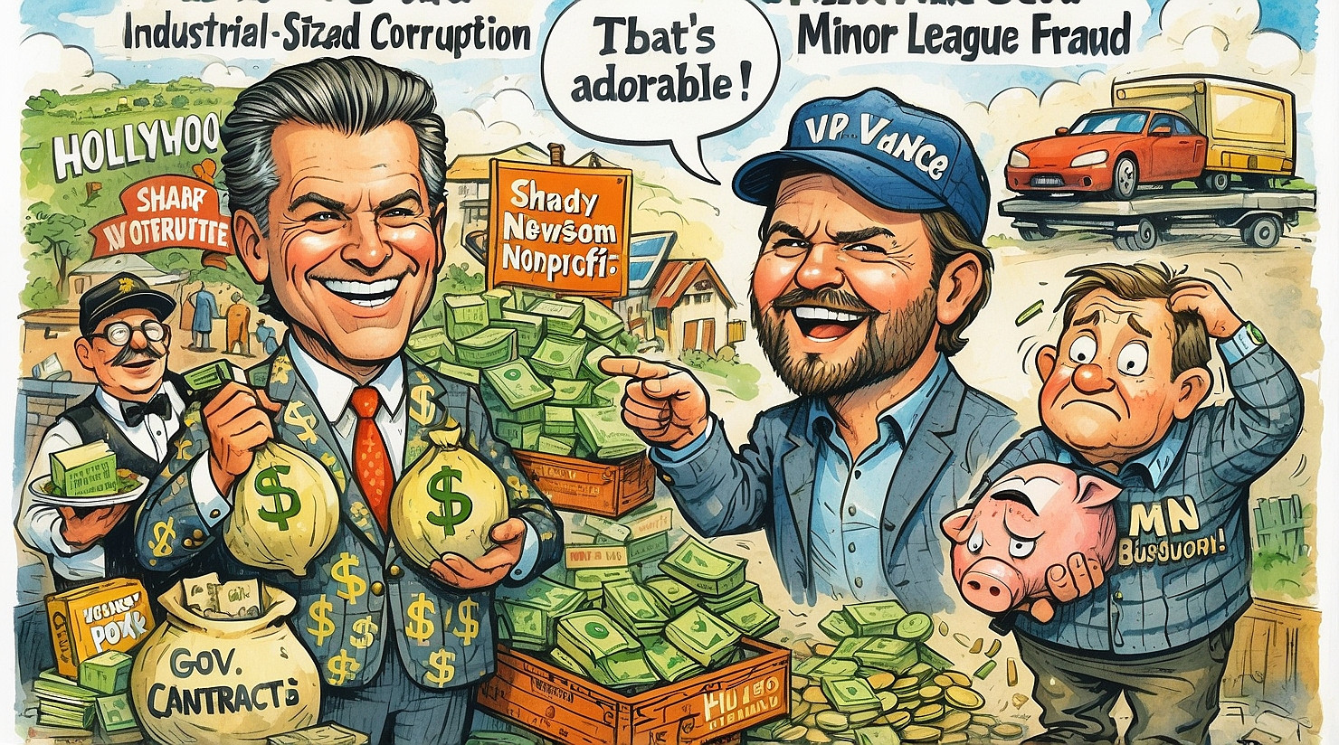 Vance explained that while Minnesota misplaces taxpayer money like a distracted intern, California has perfected a vertically integrated grift economy involving nonprofits, emergency powers, green initiatives, and a long paper trail that somehow never leads anywhere.