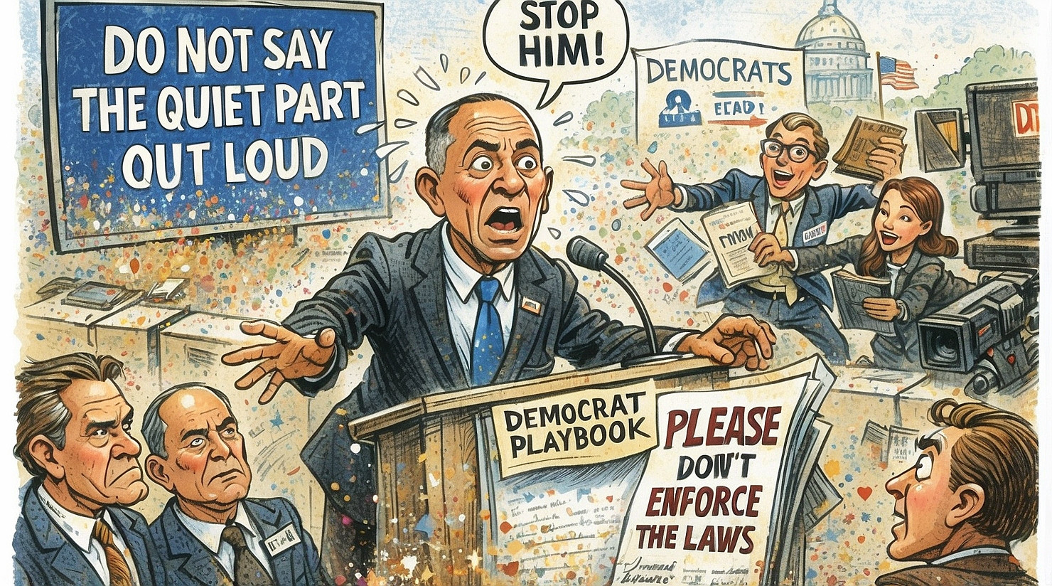 Behind him, a massive teleprompter briefly flashed DO NOT SAY THE QUIET PART OUT LOUD, before exploding into a shower of glitter and donor talking points.