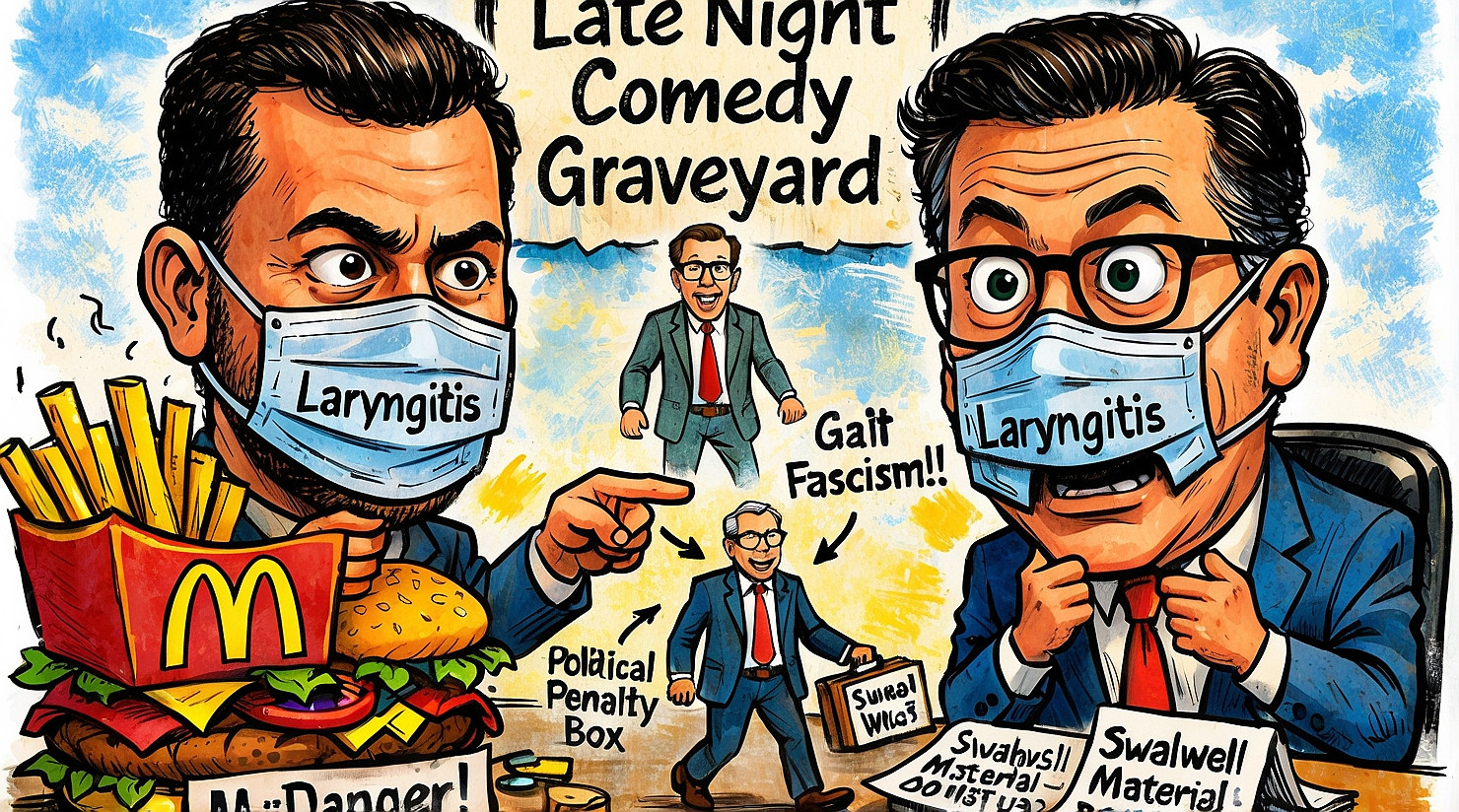 Colbert spent twelve agonizing minutes dissecting a Republican senator’s casual walk as “deeply troubling gait fascism” that threatens the very republic.
