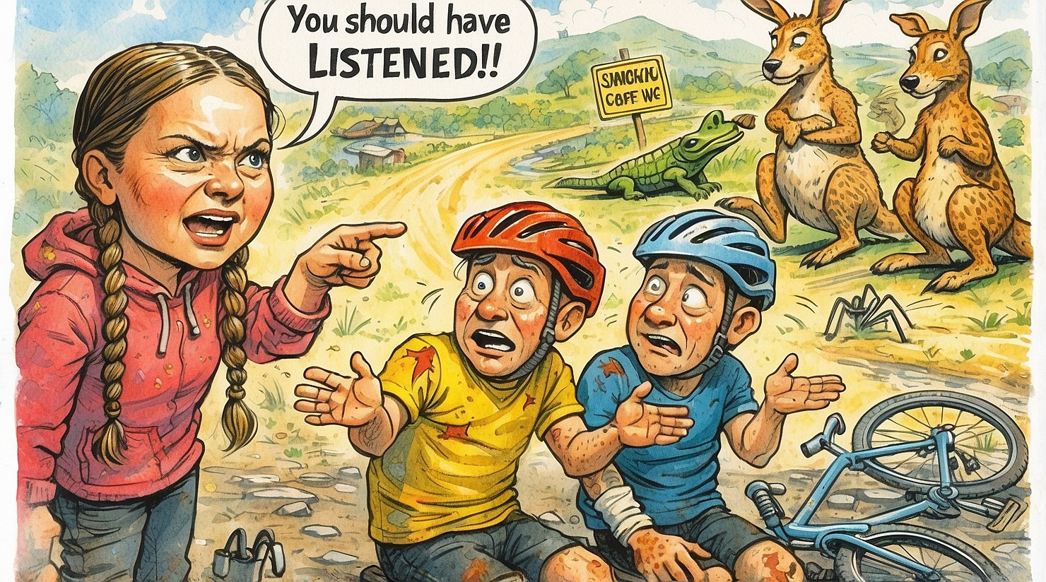 Climate activist Greta Thornberg reportedly scolded cyclists for “aggressively pedaling through sensitive marsupial spaces,” urging them to pause, reflect, and ask the kangaroos how the race made them feel before continuing.