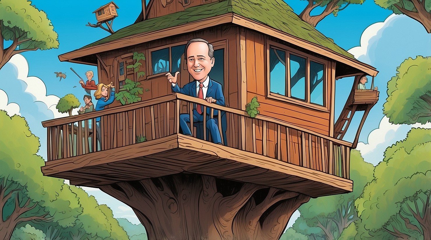 The whimsical structure was allegedly co-signed by Peter Pan and Nancy Pelosi, built as a sanctuary for Schiff and the “Lost Boys of the Woke Left” to escape accountability.