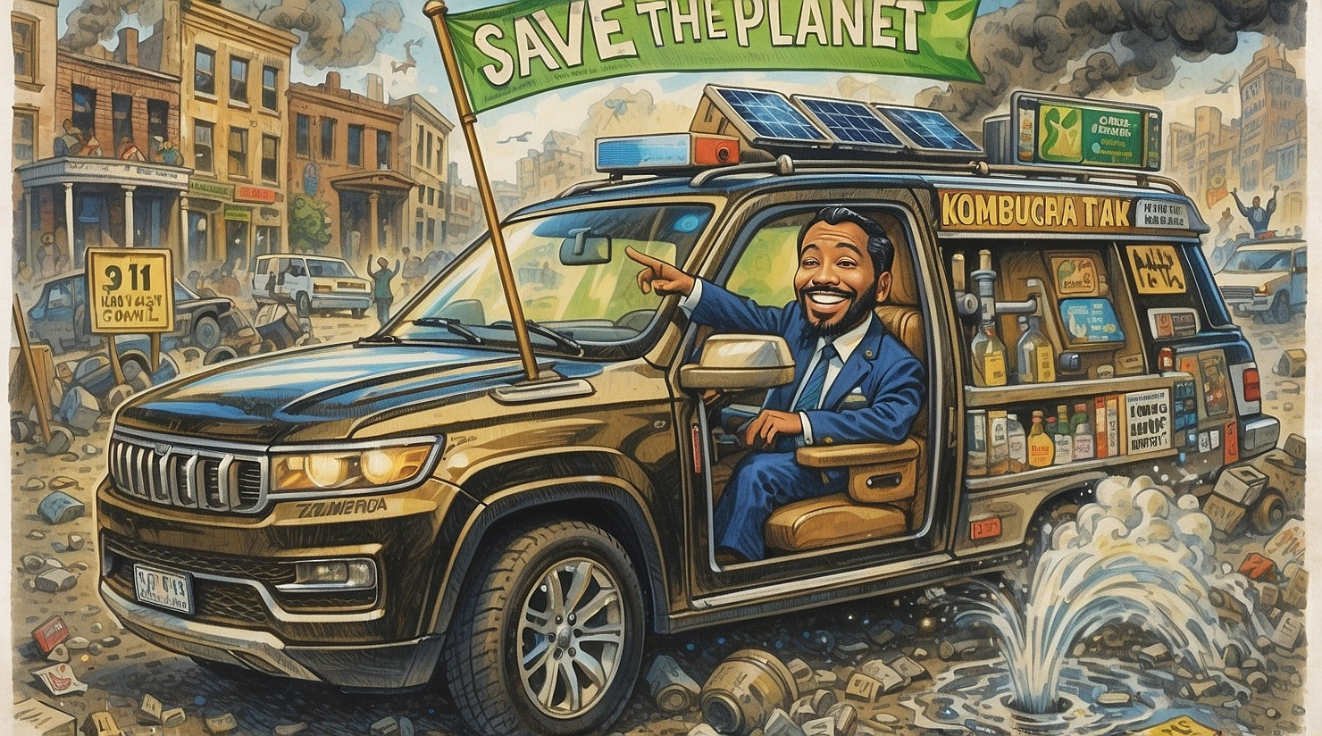 The Wagoneer now boasts a rooftop kombucha tap, a climate-poetry sound system that whispers “net zero” at stoplights, and a retractable “Save the Planet” banner that deploys every time the engine gulps premium fuel.