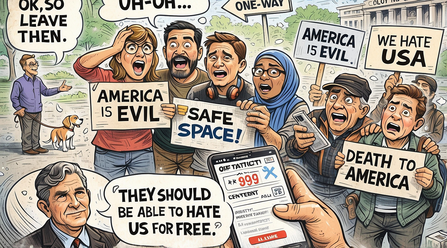 One protester attempted to clarify the situation, explaining, “We don’t hate America like that. We hate America in the way that still requires Wi-Fi, free speech, food trucks, and the ability to yell at the government without disappearing.”