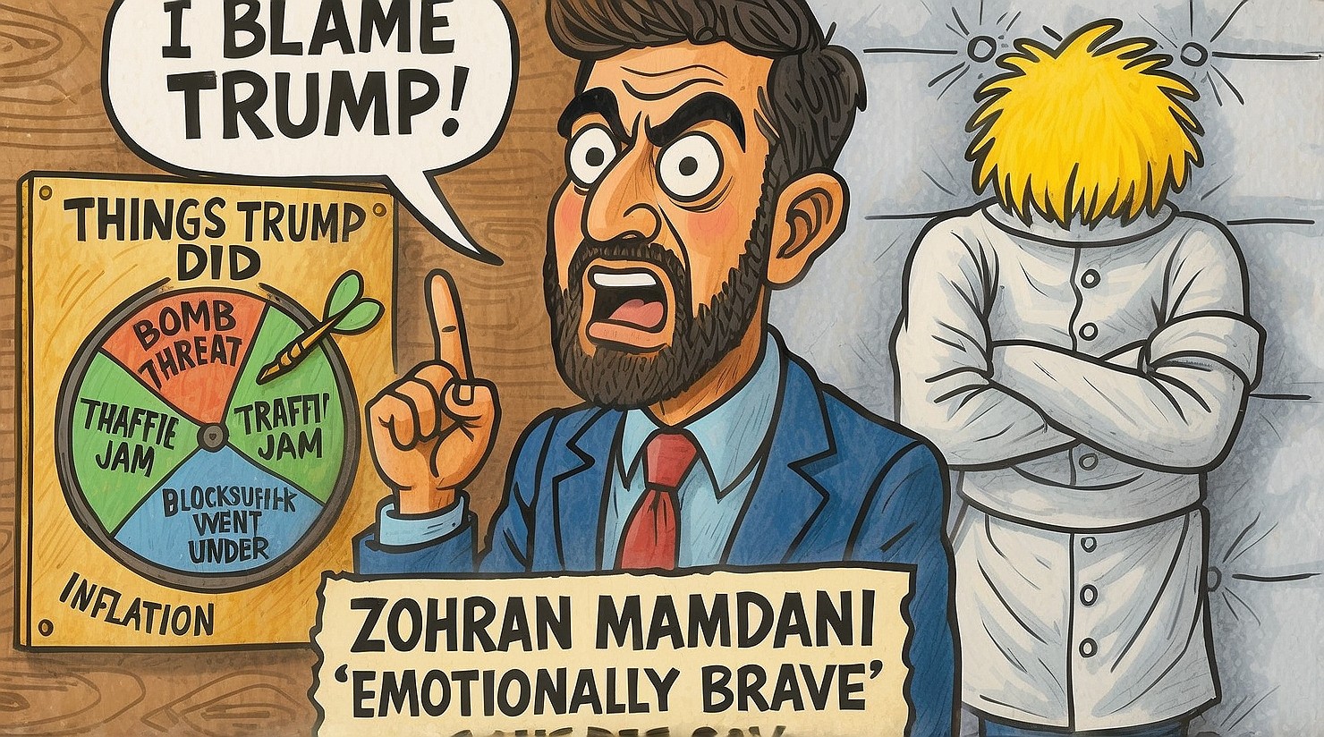 In a stunning press conference that progressives are calling “emotionally brave but intellectually homeless,” New York City Socialist Zohran Mamdani reportedly blamed President Trump for the Election Day bomb threat, a midtown traffic jam, and “that weird feeling I get when my phone battery dies,” sources have confirmed.